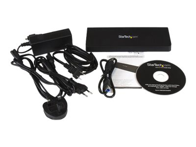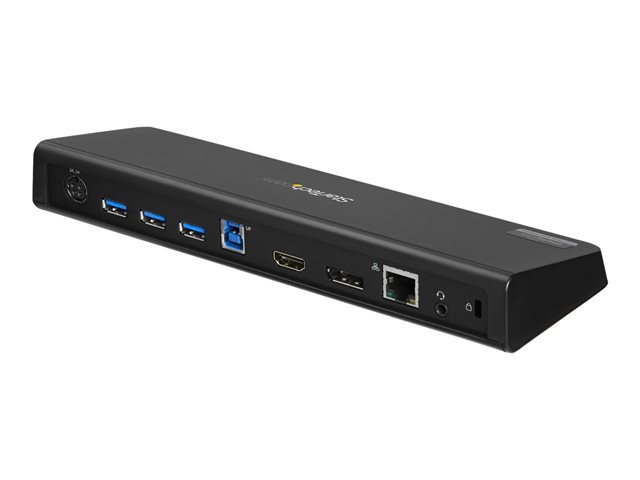 This TAA compliant dual-monitor USB 3.0 docking station combines a 4-port USB 3.0 hub, headphone and microphone audio connectors, a USB fast-charge port, and a GbE RJ45 Port with Wake-on-LAN (WOL). This 4K USB docking station supports DisplayPort plus HDMI dual video, or a single DP display at 4K Ultra HD resolutions (3840 x 2160p). The built-in USB hub features four USB 3.0 ports for connecting extra peripherals such as external hard drives or a wired mouse as if they are connected directly to your laptop. The USB 3.0 dock's always-on USB fast-charge port charges devices without a laptop connection and supports USB Battery Charging Specification 1.2 making it easy to charge your tablets and other mobile devices. The integrated RJ45 Ethernet port supports speeds of 10/100/1000Mbps, giving you an instant connection to a reliable wired network. This docking station with DisplayPort and HDMI is universally compatible, working with Mac and Windows USB 3.0 equipped laptops and includes a 2ft. USB 3.0 cable for quick setup. StarTech.com laptop docking stations can be used for cost savings and faster deployment with just a single cable.