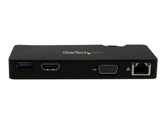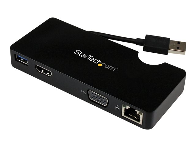 Create a mobile workstation using your Ultrabook or laptop USB 3.0 port via this portable USB 3.0 mini dock. The travel docking station for laptops lets you transform your laptop or Ultrabook into a mobile workstation. It adds HDMI or VGA video output, a USB 3.0 hub port, and a Gigabit Ethernet RJ45 port, through a single USB 3.0 host connection. The travel-friendly dock helps you overcome the port limitations of modern mobile computers, making it ideal for your laptop, Microsoft Surface Pro 4, SurfacePro 3, Surface 3, Surface Pro 2 or Surface Book. Now, you can avoid the nuisance of carrying multiple adapters. By consolidating four essential connection ports into one convenient device, the travel dock is the perfect laptop accessory. It features a lightweight, compact design that fits nicely into your travel bag and also features an integrated host connection cable that tucks neatly into the docking stations casing. A versatile solution for connecting an additional display to your laptop, the travel docking station offers HDMI video output with audio, or VGA video output, providing two popular interfaces for connecting a television, projector, or monitor as a second display, with support for resolutions up to 2048x1152 (QWXGA). Leveraging the high-bandwidth (5Gbps) USB 3.0 interface to deliver flexible video output, a USB 3.0 hub port, and Gigabit Ethernet, you can quickly set up a multi-functional workstation while on the run, without sacrificing one of your laptop USB ports. Setup is seamless and hassle-free; the travel dock will automatically download the latest driver when connected to a Mac or Windows system with an active network connection.