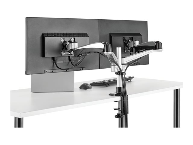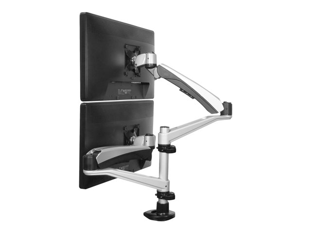 Customize your workspace like never before with this premium desk-mount dual monitor arm. It supports two VESA (75 x 75, 100 x 100) monitors, side-by-side or stacked. The full-motion articulating arms with spring-assisted height adjustment let you reposition your monitors with ease.