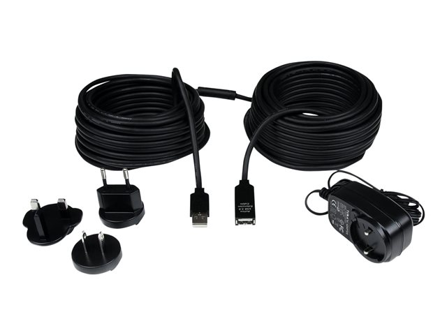 The USB2AAEXT20M 20m Active USB 2.0 Extension Cable offers one USB-A male connector and one USB-A female connector, and provides an active extension of USB 2.0 devices of up to 20-meters (66-feet). An all-in-one cable for overcoming distance restrictions as well as power source limitations, the active USB 2.0 extension cable incorporates bus-powered active circuitry to ensure performance beyond the length limits of standard USB cables. Plus you can daisy chain 2 cables for a total USB extension of up to 40-meters. If necessary, the USB device can be powered from a wall outlet using the Universal AC power adapter (provided with the cable). The USB2AAEXT20M repeater cable supports the full USB 2.0 bandwidth of 480 Mbps.