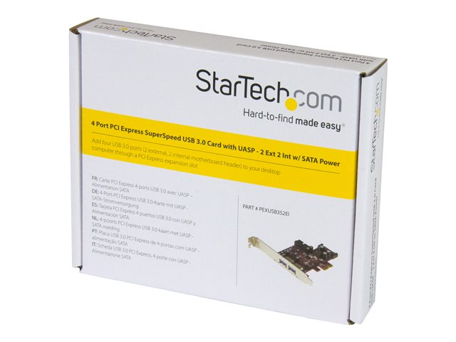 Add front or rear panel USB 3.0 ports to your computer case using USB 3.0 motherboard-style headers. This PCI Express USB 3.0 card offers a cost-effective upgrade that lets you add four USB 3.0 ports to your computer through a PCIe slot. It offers two external ports plus two internal USB 3.0 headers to help adapt your desktop or server to support a variety of USB 3.0 devices. With extra motherboard-style USB 3.0 headers you have the flexibility to add more internal USB 3.0 devices to your PC. When your existing headers are occupied, you can connect front panel hubs or card readers using this versatile alternative to costly motherboard and computer upgrades. For added convenience, the card integrates two external USB 3.0 ports, so you can plug in more devices such as external hard drives or printers. The USB 3.0 card is easy to install and requires no additional drivers or software in natively supported Windows 8.1 / 8 operating systems. Plus, it features a dual profile design that fits in standard or low-profile cases, so you can rest assured it will fit in your small form-factor system if needed. Connecting older peripherals isn't a problem either. So, there's no need to purchase new devices since the adapter card is backward compatible with your USB 2.0 and 1.x technology. This high-performance SuperSpeed USB 3.0 card supports data transfer rates up to 5 Gbps and is enhanced with UASP support, which can perform ~70% faster read speed and 40% faster write speed over traditional USB 3.0, when paired with a Note: UASP (USB Attached SCSI Protocol), is supported in Windows 8, 8.1, Server 2012 and Linux kernel 2.6.37 or later. Test results were obtained using an Intel Ivy Bridge system, StarTech.com add-on USB 3.0 cards, a UASP-enabled StarTech.com enclosure, and a SATA III solid-state drive.