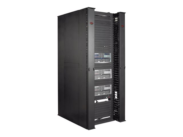 Snap-on covers conceal cables within vertical cable managers at the end of a post row of open frame racks for a clean, professional look.