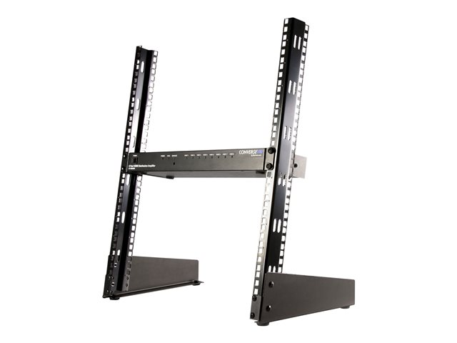 Mount smaller rack mountable devices right at your desk with this lightweight 12U 2 post desktop rack. The RK12OD 12U 19in Desktop Open Frame 2 Post Rack provides the perfect mounting option for smaller Audio/Video and IT equipment where space is limited and a full sized cabinet is not required. This TAA compliant product adheres to the requirements of the US Federal Trade Agreements Act (TAA), allowing government GSA Schedule purchases. The 12U rack features a compact and lightweight free-standing design that is suitable for installation on or around your desk giving you easy access to the mounted equipment in your workspace. This lightweight 2 post rack is engineered to meet EIA rack mount standards and includes a pack of 20 M5 screws and Cage Nuts, allowing you to mount up to five devices into the rack right away.