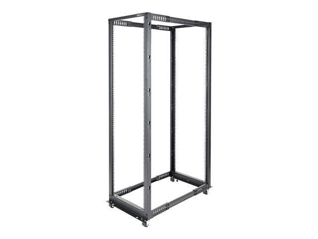Store your servers, network and telecommunications equipment in an adjustable 42U open-frame rack. The 4POSTRACK42 42U Server Rack lets you store your servers, network and telecommunications equipment in a sturdy, adjustable depth open-frame rack. Designed with ease of use in mind, this 42U rack offers easy-to-read markings for both rack units (U) and depth, with a wide range of mounting depth adjustments (22 - 40in) that make it easy to adapt the rack to fit your equipment. This durable 4-post rack supports a static loading capacity of up to 1320lbs (600kg), and offers compliance with several industry rack standards (EIA/ECA-310, IEC 60297, DIN 41494) for a universal design that's compatible with most rack equipment. For a complete rack solution that saves you time and hassle, the rack includes optional accessories such as casters, leveling feet and cable management hooks. The base is also pre-drilled for securing the rack to the floor if needed, providing you with many options to customize the rack to fit your environment.