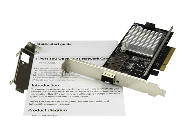 Get advanced connectivity over multimode or single-mode fiber, by adding a 10GBase-LR/SR open SFP+ port to your server or workstation. This fiber network card delivers reliable, high-performance network connectivity, by adding an open SFP+ slot to your server or high-powered workstation. It provides an easy and cost-effective way to upgrade your server or workstation to a 10 Gigabit fiber network using the SFP+ module of your choice and gives you the flexibility to use either multimode or single-mode fiber. Several factors drive the need for more bandwidth in your network infrastructure. An increase in the number of network users and data-intensive applications, such as multimedia streaming and large file transfers all contribute to the need for more bandwidth in your network infrastructure. This fiber NIC lets you take advantage of the increased speed and stability of a 10 Gigabit network, with data transfers of up to 10Gbps. The fiber NIC is compatible with most 10GbE SFP+ transceivers. This gives you flexible and scalable configuration options for connecting your computer directly to a fiber network, at greater distances. The card features an open SFP+ slot with support for one interchangeable 10GBase SFP+ module. This gives you the option to use the fiber transceiver module that best suits your network needs based on distance and connector type. StarTech.com offers a variety of SFP+ transceiver modules including the SFP10GLRST single-mode SFP+ the SFP10GLRMST multi-mode SFP+, and SFP10GSRST multimode LC with DDM. In addition, StarTech.com SFP+ Cables provide a dependable solution for linking telecom and data communications equipment, such as routers and switches. The 10 Gigabit network card features the Intel 82599 chipset, delivering the power, performance and enhanced capabilities you need for reliable network connections to your server or computer. The Intel chip offers many advanced features including Intel Virtualization Technology for Connectivity, PXE network boot support and up to 15K jumbo frame support.
