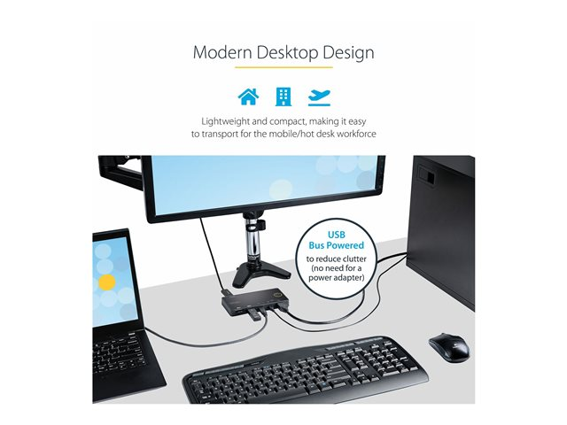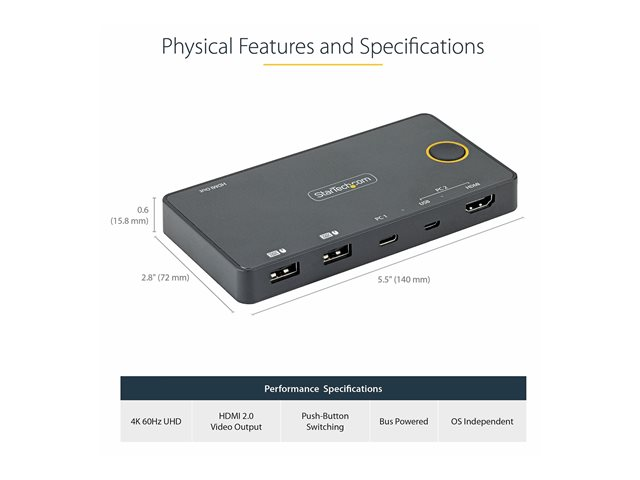 Startech 2 Port Hybrid USB-A + HDMI & USB-C KVM Switch, Single 4K 60Hz HDMI 2.0 Monitor, Compact Desktop and/or Laptop HDMI KVM Switch, USB Bus Powered, Thunderbolt 3 Compatible