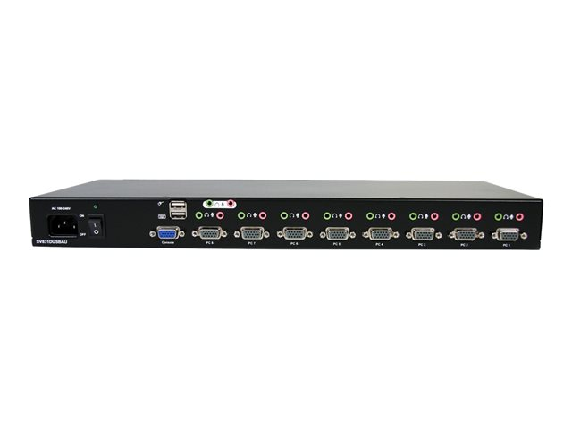 Control up to 8 VGA and USB computers from a single keyboard, mouse and monitor. The SV831DUSBAU 8 Port Rack Mount USB VGA KVM Switch (with Audio Cables Included) allows you to control up to 8 USB computers using a single keyboard, mouse and monitor, and features Audio and Microphone ports to switch between audio signals as well as PC ports. Based on a 1U rack mountable slim form factor design, this 8 Port USB KVM uses rear cable connections to maximize space efficiency. Multiple KVM units can also be connected (cascaded) together for control of up to 64 computers, ensuring a scalable KVM solution that can be expanded as necessary. To ensure seamless operation, the switch features automatic and manual scan modes, supports both hot-key and front panel push-button switching, and features a convenient OSD (on-screen display) for added configuration options.